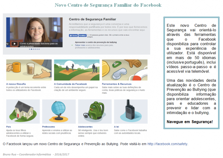 O Facebook lançou um novo Centro de Segurança e Prevenção ao Bullying. Pode visitá-lo em http://facebook.com/safety.